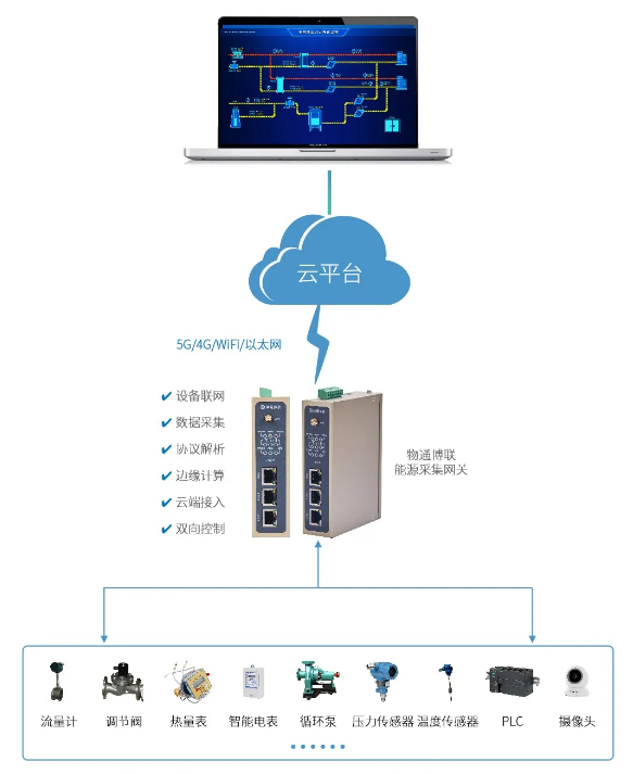 通過部署能源數采網關,能夠實時采集流量計、智能電表、熱量表、稱重儀器、循環泵、調節閥、溫度傳感器、壓力傳感器等設備,將供熱量、耗汽量、耗水量、耗電量、燃料消耗量、余熱利用量、溫度、壓力等數據對接到智慧供熱能源管理平臺中,從而將熱源、管網、中繼泵站、熱力站等納入統一的節能評價系統中,實現對能源的監測、管理、統計與分析,助力提高能源利用效率與管理水平,實現節能、降本與增效的全面發展。